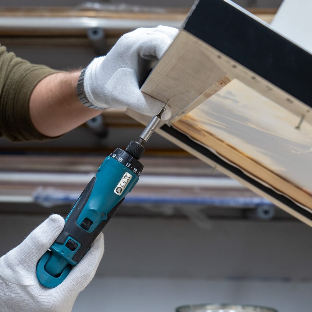 Alle Rahmen werden bei uns im Haus gefertigt. Mit einer Doppelgehrungsstanze schneiden wir auf den Millimeter genau. Die Rahmenschenkel werden sorgfältig verleimt und geheftet. Das Ergebnis ist eine stabile, saubere Verbindung, die auch Jahrzehnte überdauert.