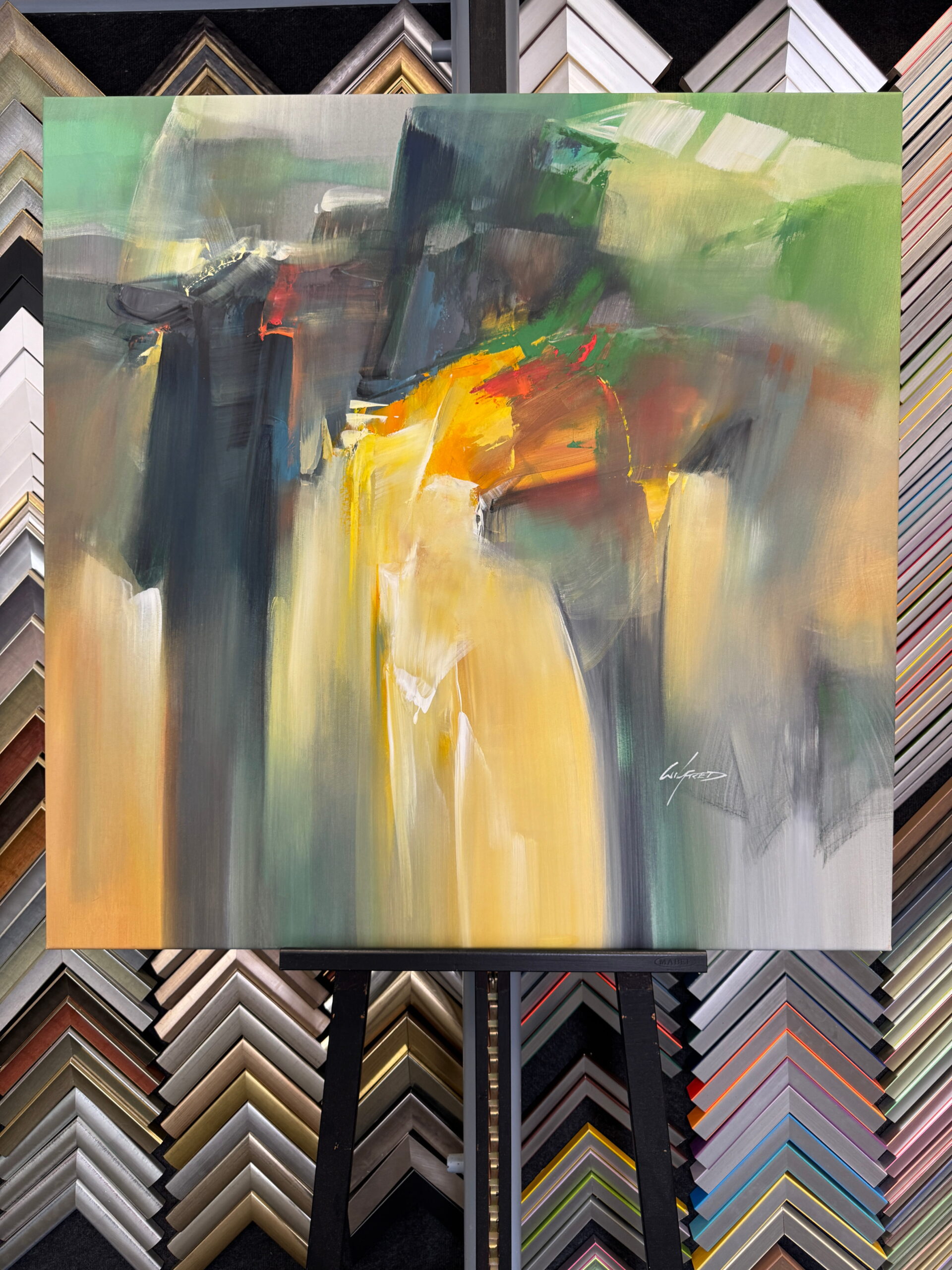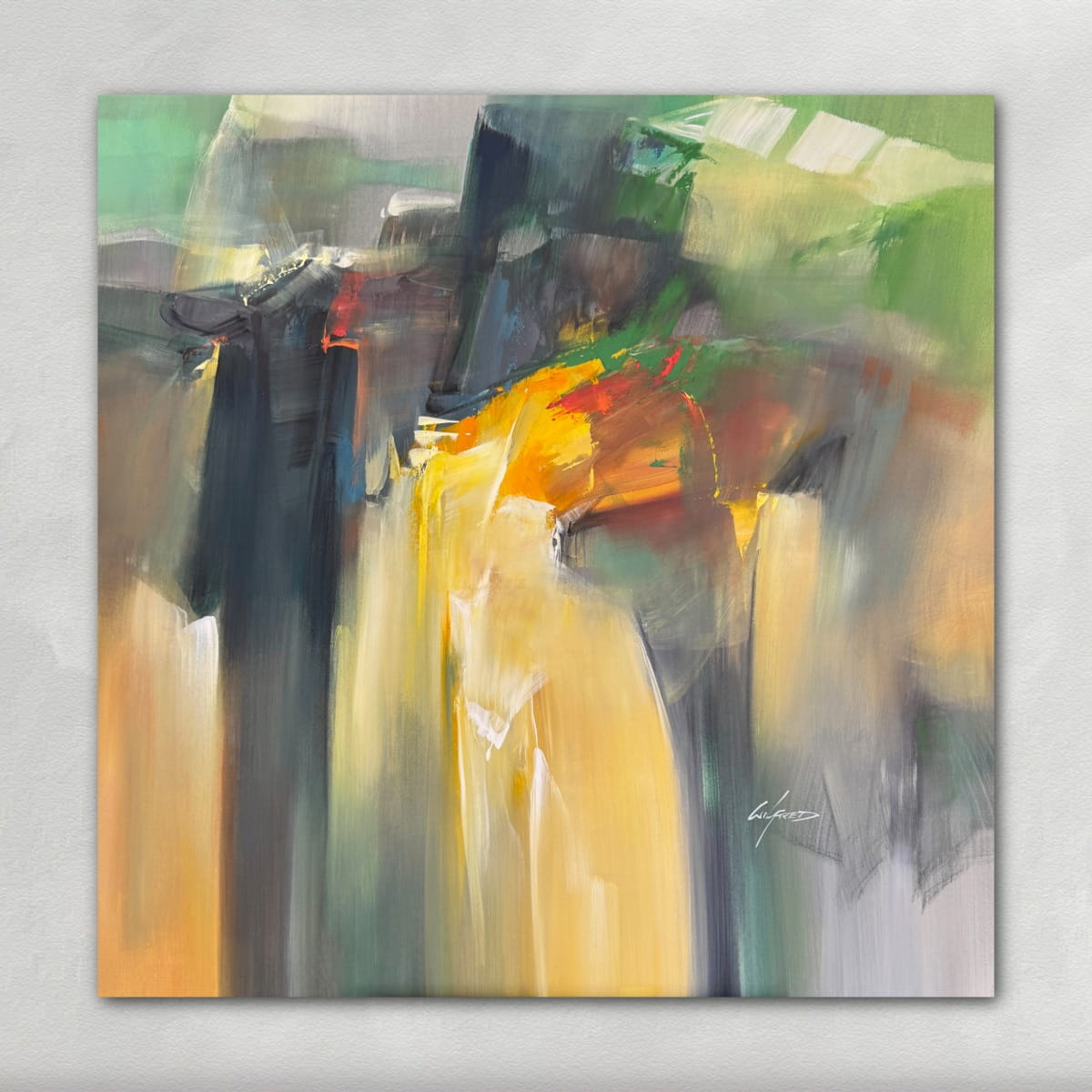 Dieses abstrakte Werk von Wilfred lebt von Bewegung, Kontrasten und einer intensiven Farbwirkung. Fließende Übergänge treffen auf kraftvolle Akzente und erzeugen eine spannungsreiche, fast atmosphärische Komposition.
