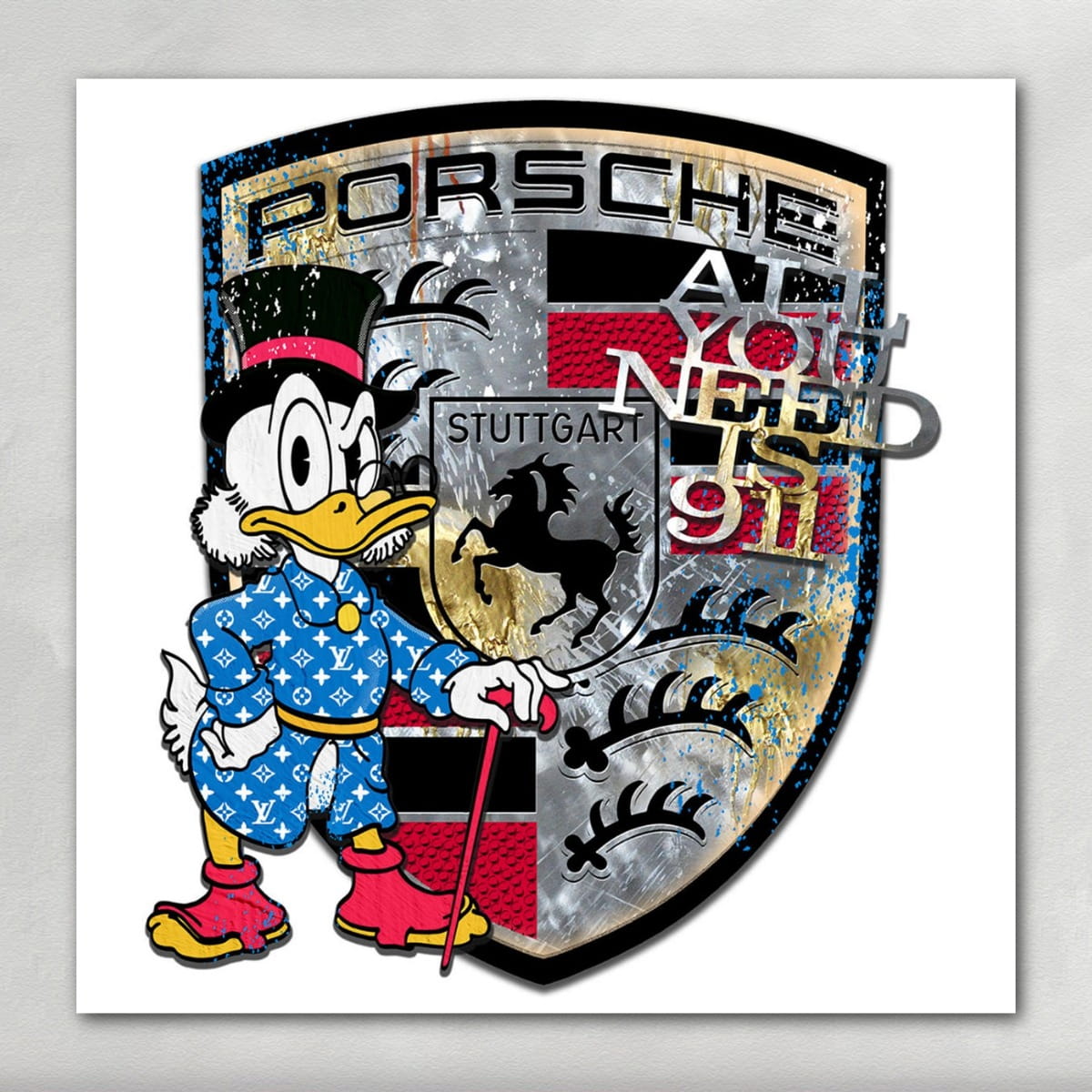 Mit seinem großzügigen Format von 130 × 115 cm eignet sich „All You Need Is 911“ perfekt als zentrales Highlight in Wohnräumen, Büros oder repräsentativen Bereichen. Das Werk zieht sofort alle Blicke auf sich und wirkt besonders in offenen Raumkonzepten.