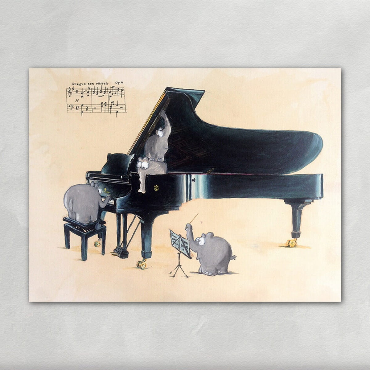 Weil es klassische Musik auf humorvolle Weise interpretiert und dabei hochwertig umgesetzt ist. Als limitierter, handsignierter Leinwand-Siebdruck mit Echtheitszertifikat verbindet „Allegro con Rüsselo“ künstlerische Qualität mit Sammlerwert.