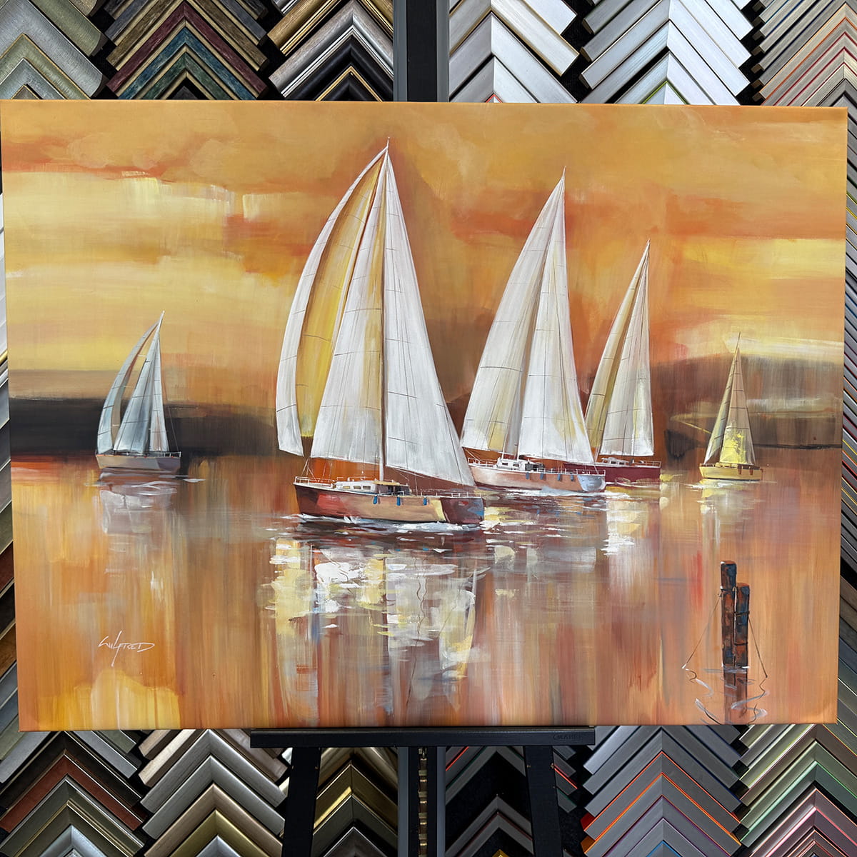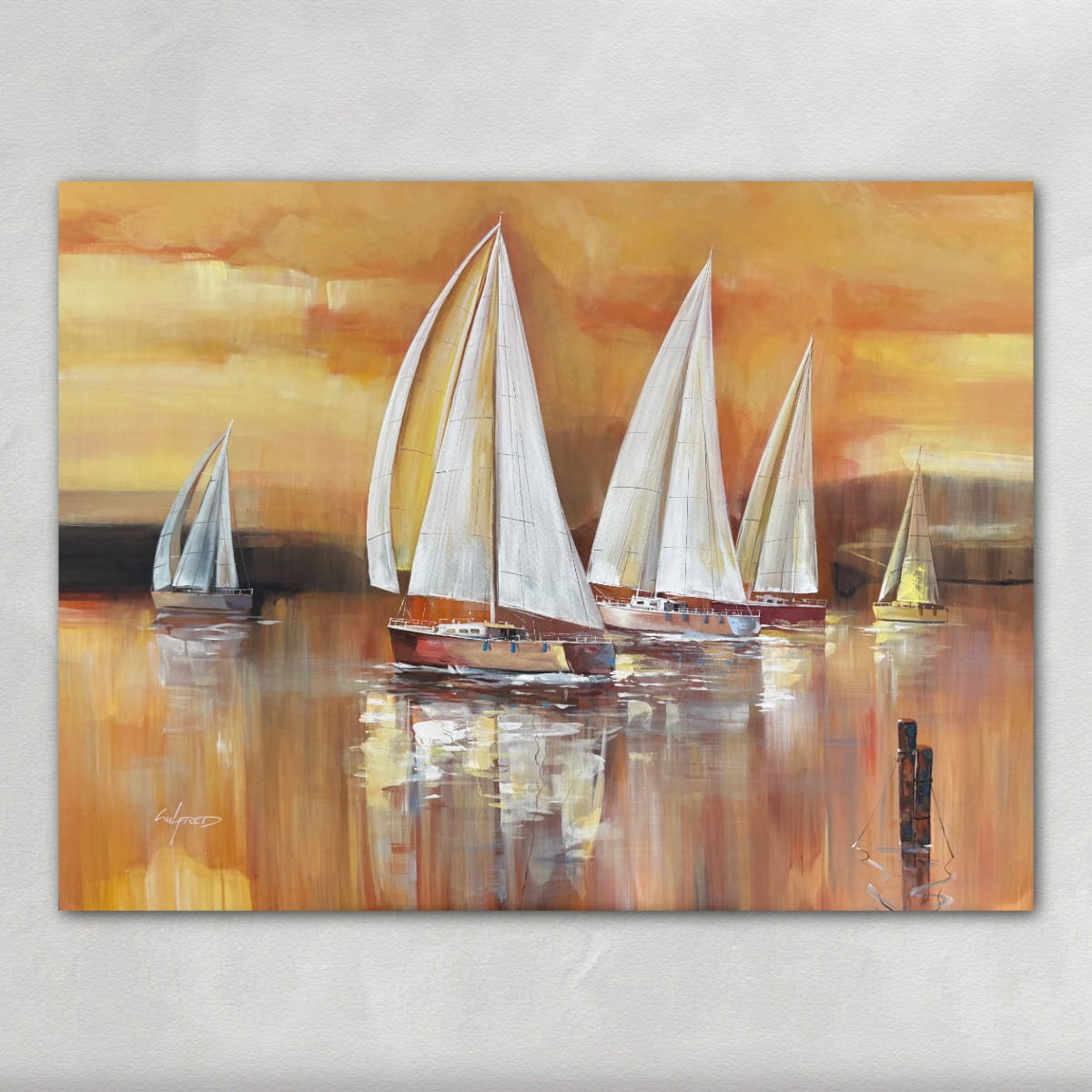 Das Gemälde „Boote“ zeigt mehrere Segelboote, die ruhig über eine spiegelnde Wasseroberfläche gleiten. Die warme Farbwelt aus Gold-, Orange- und sanften Brauntönen verleiht dem Motiv Tiefe und schafft eine entspannte, fast meditative Atmosphäre.