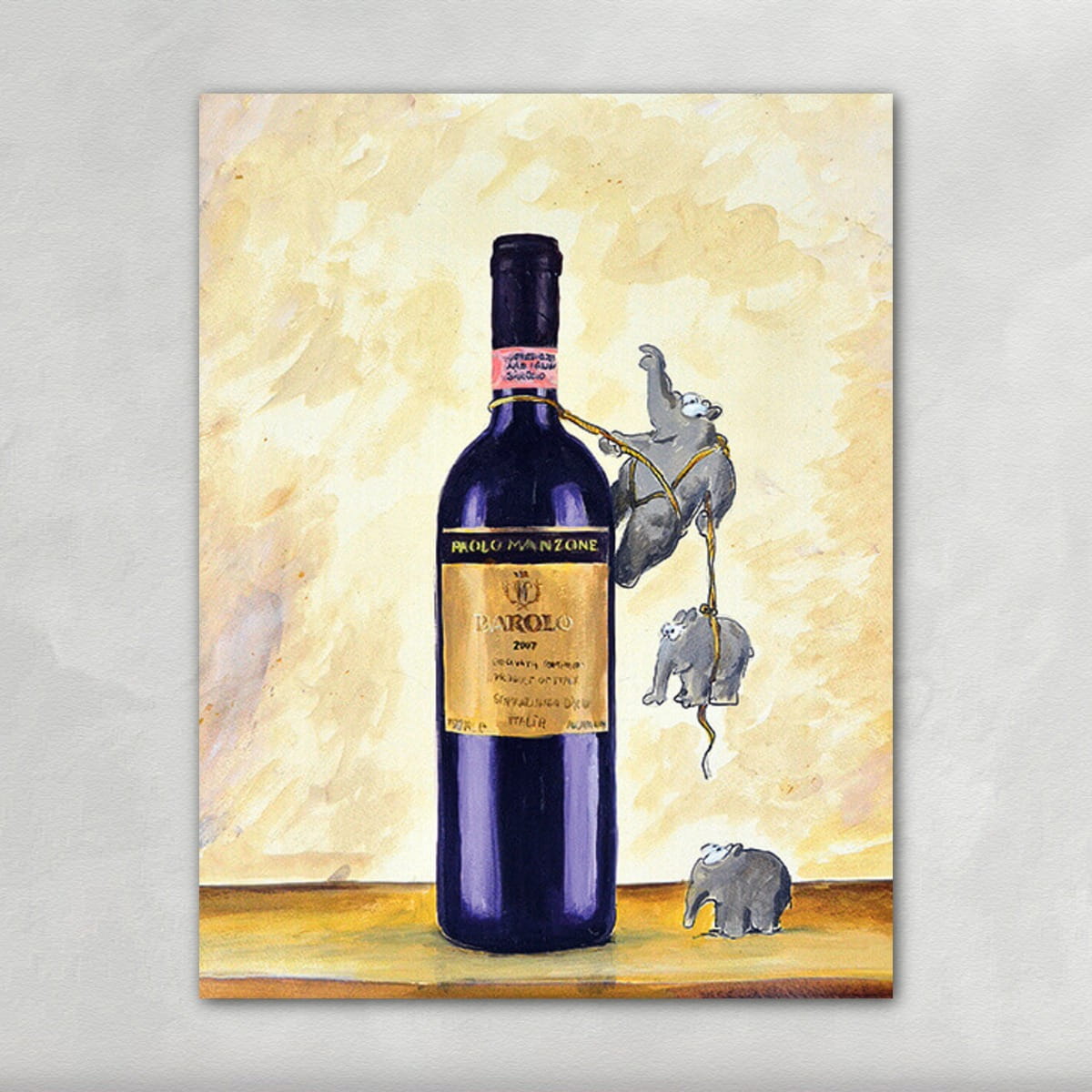 Im Zentrum steht eine große Barolo-Weinflasche, ruhig und stabil auf dem Untergrund platziert. An ihr hängt ein Seil, an dem mehrere kleine Ottifanten nacheinander emporsteigen. Einer hat es fast geschafft, ein anderer folgt, während unten ein weiterer Elefant aufmerksam zusieht.
