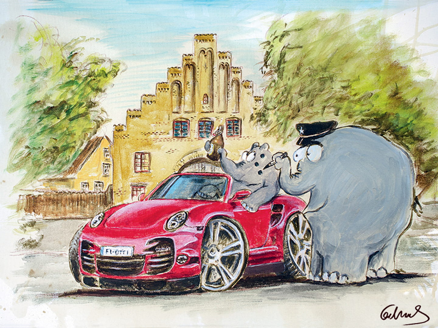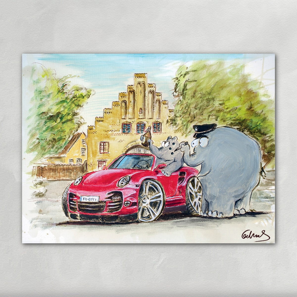 Das Motiv lebt vom Kontrast zwischen Kraft und Kontrolle, Geschwindigkeit und Stillstand – umgesetzt mit typisch Ottoschem Humor.