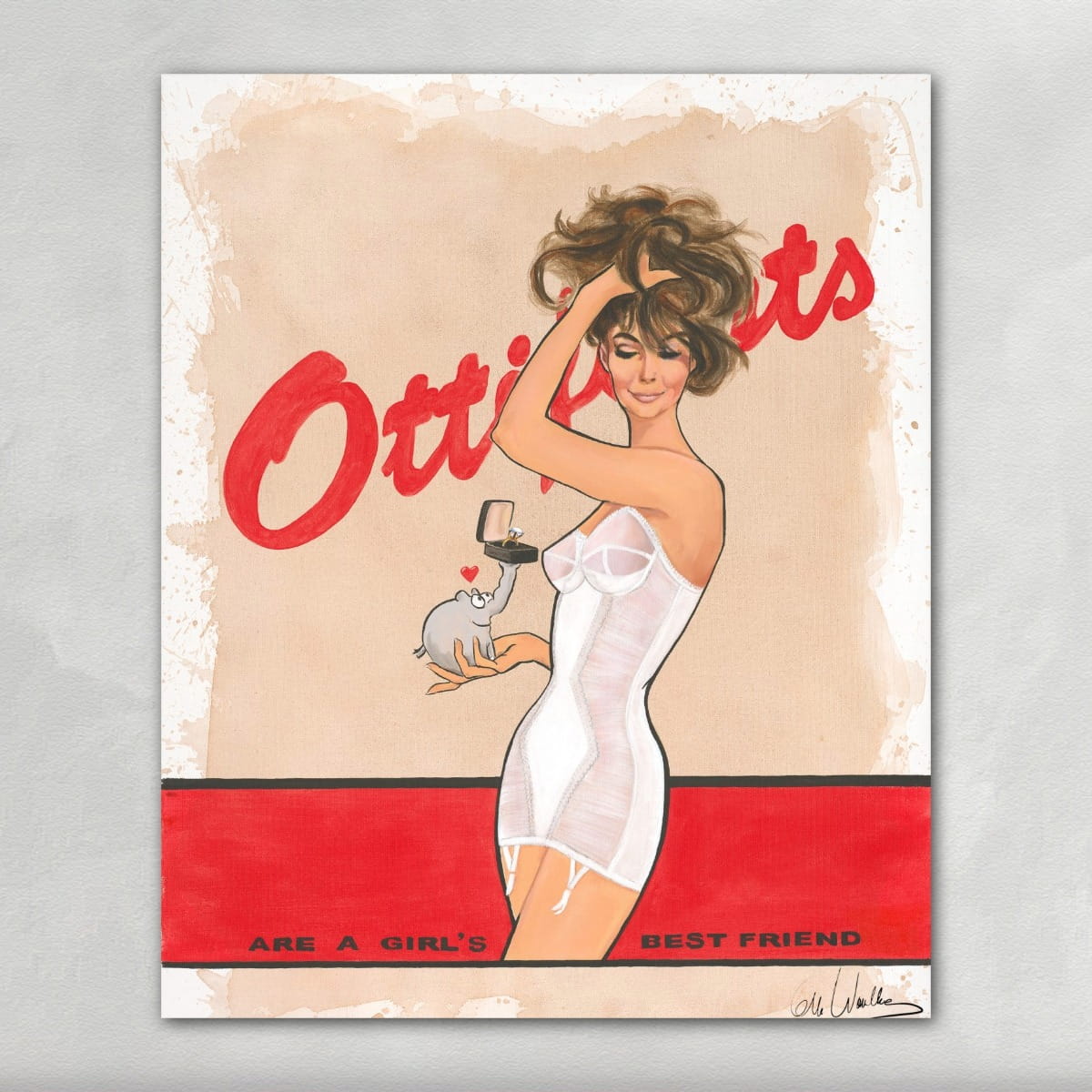 „Girls Best Friend“ ist ein Siebdruck von Otto Waalkes, der klassische Eleganz mit seinem typischen Humor verbindet. Das Motiv spielt bewusst mit einem bekannten Popkultur-Zitat und ergänzt es durch den unverwechselbaren Otto-Elefanten.
