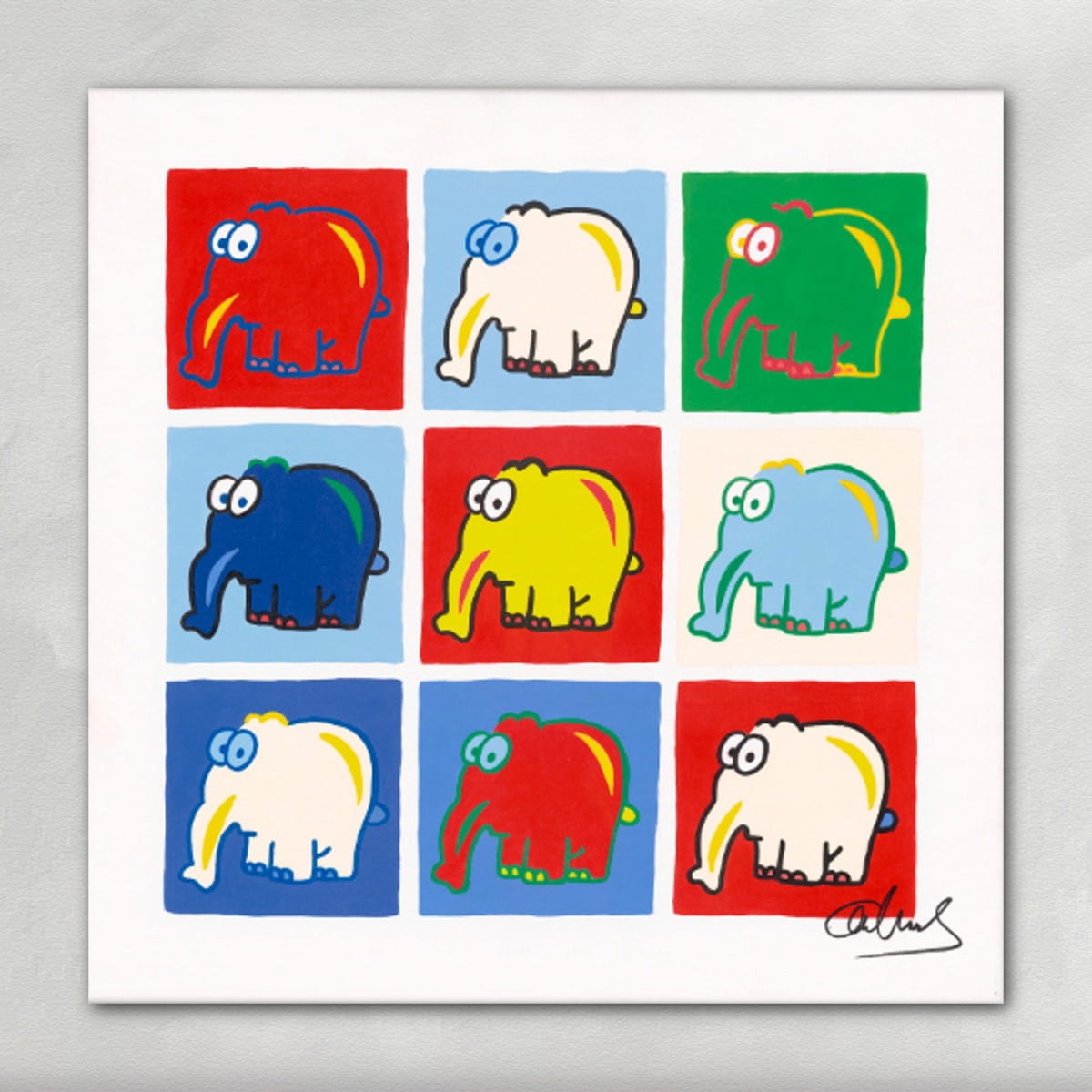 Das Bild zeigt neun Ottifanten, jeweils in klar abgegrenzten Farbflächen dargestellt. Jede Figur ist formal identisch, unterscheidet sich jedoch durch kräftige, kontrastreiche Farbkombinationen. Die serielle Anordnung erinnert unmittelbar an klassische Pop-Art-Motive und macht das Werk auf den ersten Blick verständlich.