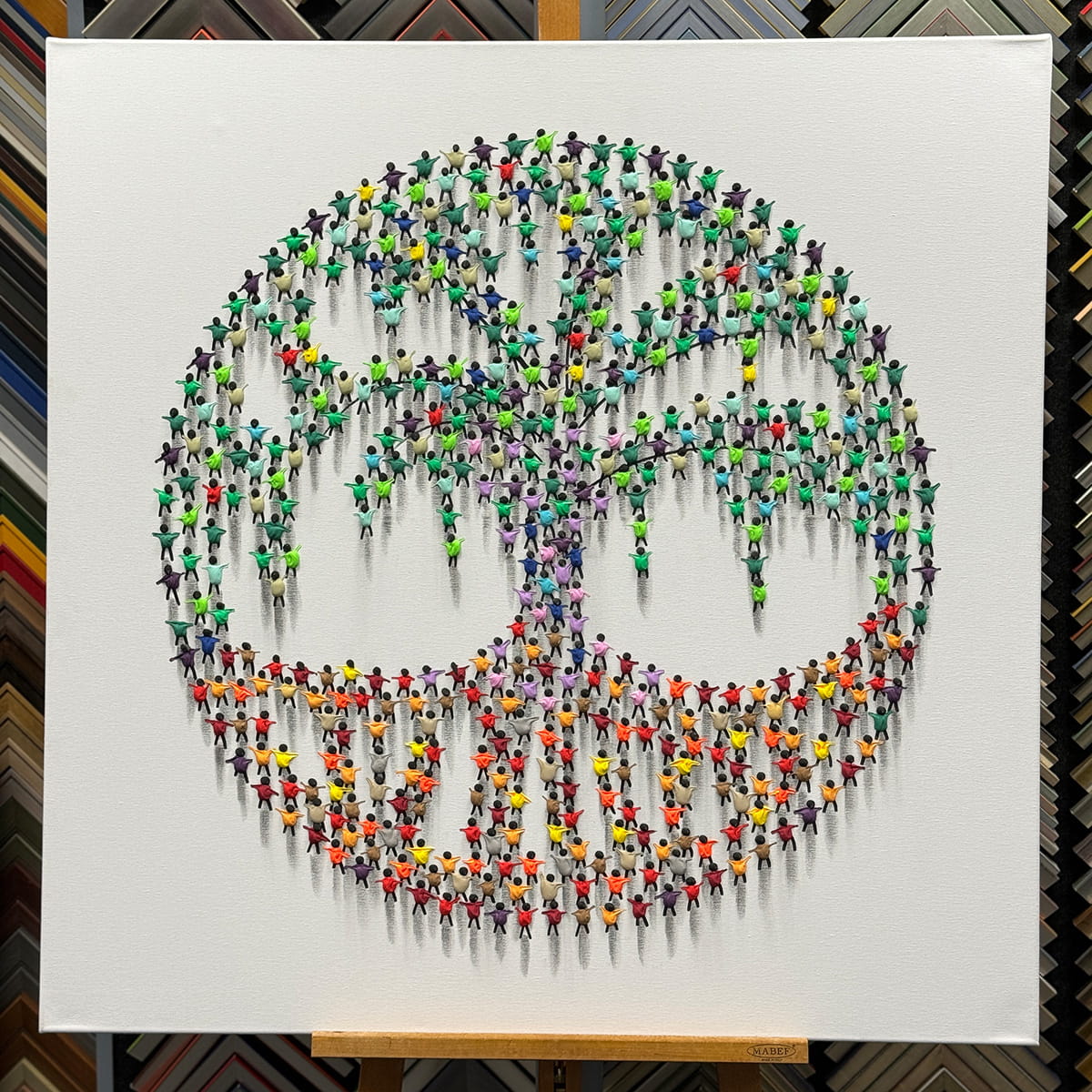 Der Baum als zentrales Symbol steht seit jeher für Leben, Entwicklung und Stabilität. In diesem Werk entsteht er nicht aus Linien oder Flächen, sondern aus vielen einzelnen, individuell gestalteten Figuren. Jede Figur trägt zur Gesamtform bei – keine ist allein, alle sind Teil des Ganzen.