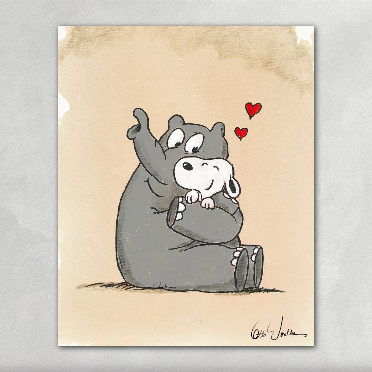 „Meaning of Love“ ist ein Siebdruck von Otto Waalkes, der Liebe nicht laut, sondern leise und innig erzählt. Das Motiv konzentriert sich auf Nähe, Geborgenheit und emotionale Verbundenheit – reduziert auf eine einzige, berührende Szene.