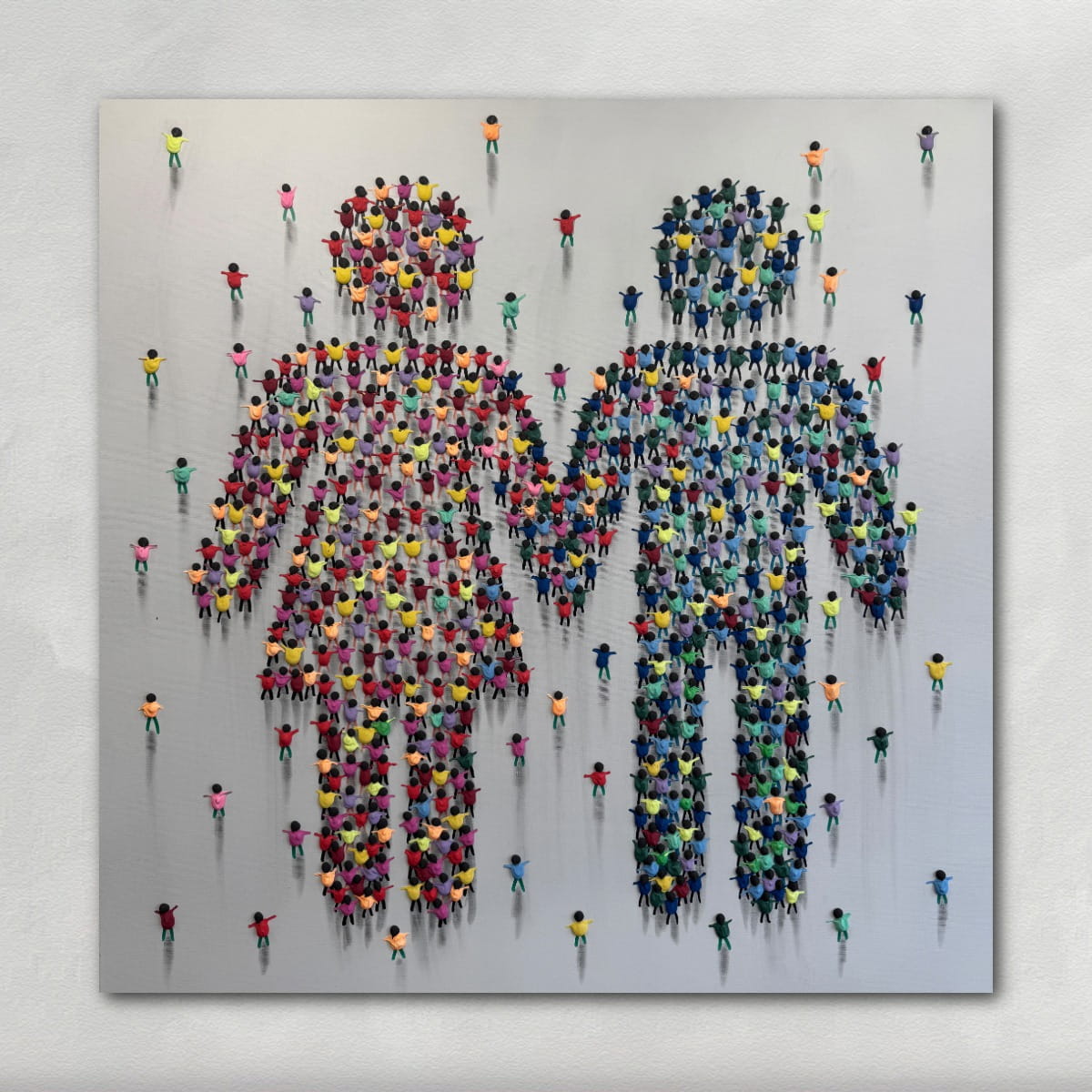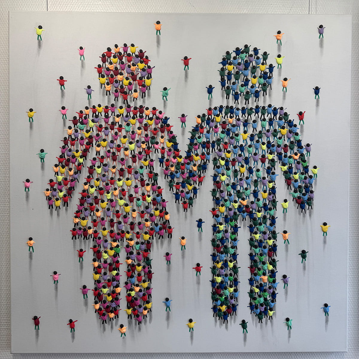 Mit „Personen“ reduziert Juan Aliaga das Thema Mensch auf das Wesentliche – und macht es gerade dadurch besonders kraftvoll. Zwei Figuren entstehen aus einer Vielzahl kleiner, farbiger Individuen und stehen sich gegenüber. Ein Sinnbild für Begegnung, Dialog und Verbindung.