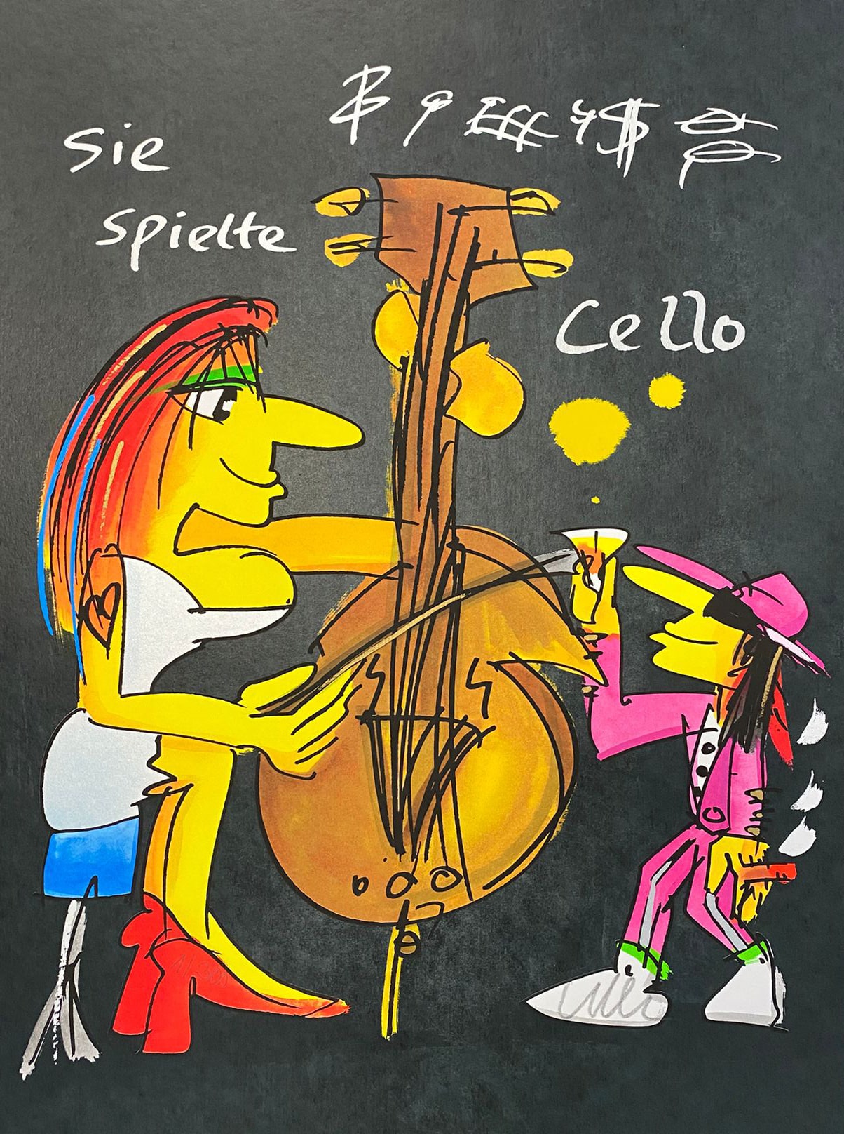 „Sie spielte Cello (Black Edition)“ ist ein Siebdruck von Udo Lindenberg, der Musik, Begegnung und Beobachtung in einer klaren, erzählerischen Szene verbindet. Der dunkle Hintergrund verleiht dem Motiv zusätzliche Tiefe und lässt Farben, Linien und Figuren besonders prägnant hervortreten. Das Werk wirkt konzentriert und lebendig zugleich – ruhig in der Aussage, stark im Ausdruck.