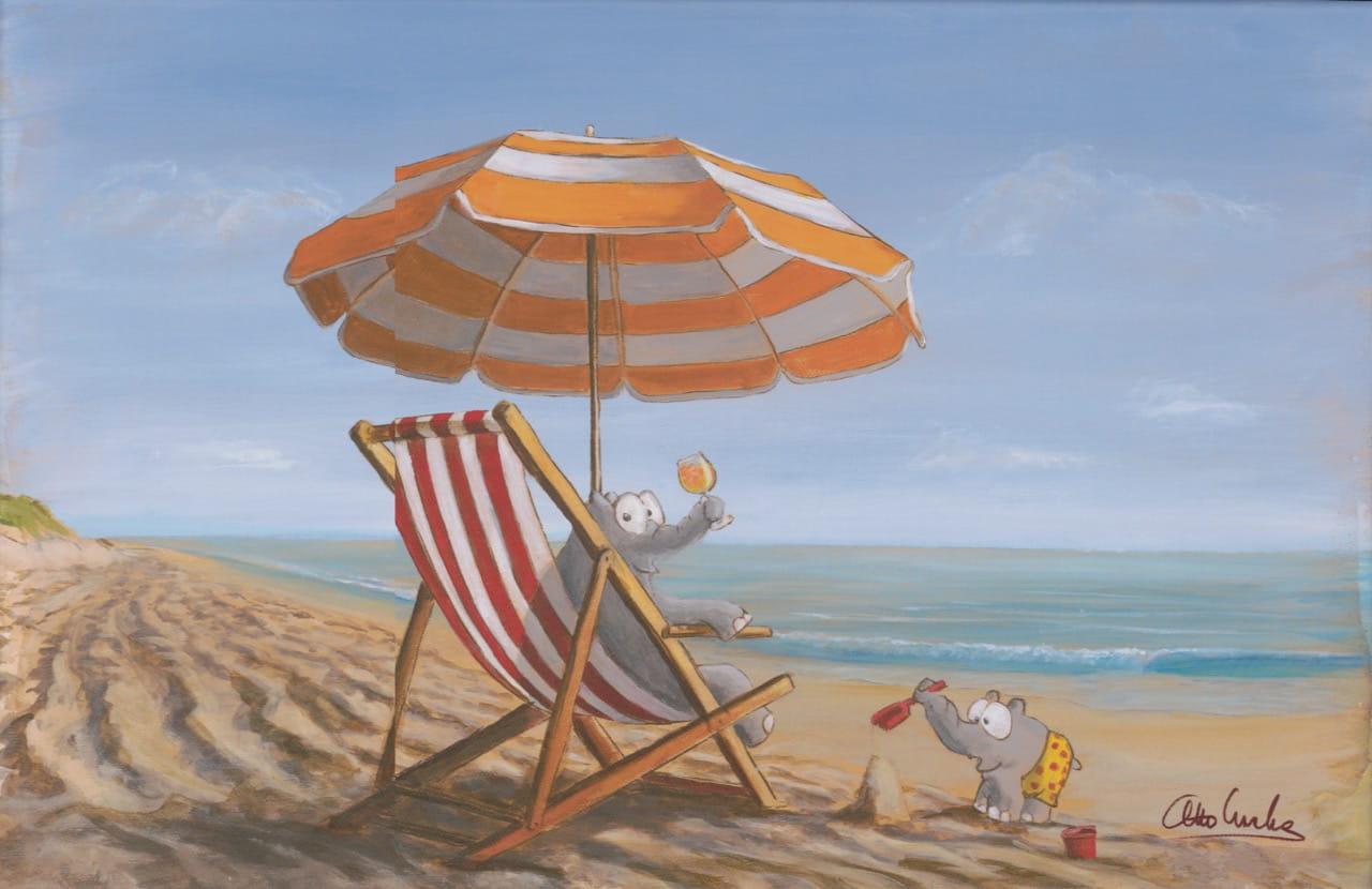 Im Mittelpunkt steht ein Ottifant, der entspannt im Strandstuhl sitzt und ein Getränk genießt. Sonnenschirm, Meer und Sand bilden die ruhige Kulisse. Ein kleiner Ottifant im Vordergrund sorgt für zusätzlichen Charme und verstärkt den humorvollen Charakter der Szene.