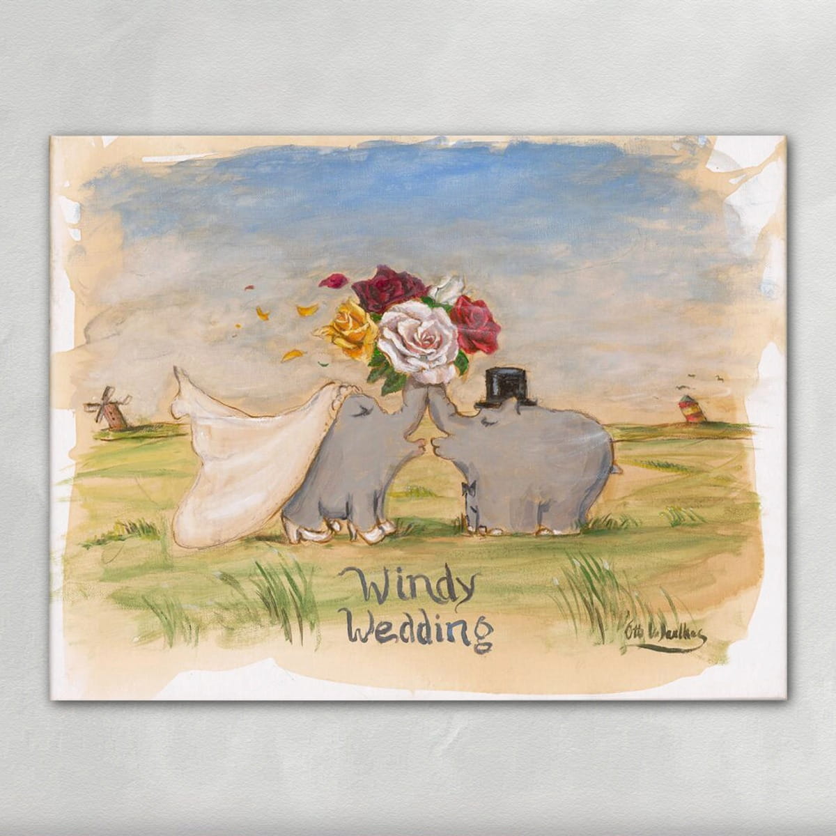 Im Mittelpunkt stehen zwei Elefanten, die sich küssend gegenüberstehen. Einer trägt einen Zylinder, der andere einen Brautschleier – ein klares Zeichen für eine Hochzeitsszene. Der Wind spielt mit dem Schleier und den Rosen, die zwischen den beiden Figuren schweben, wodurch Bewegung und Leichtigkeit entstehen.