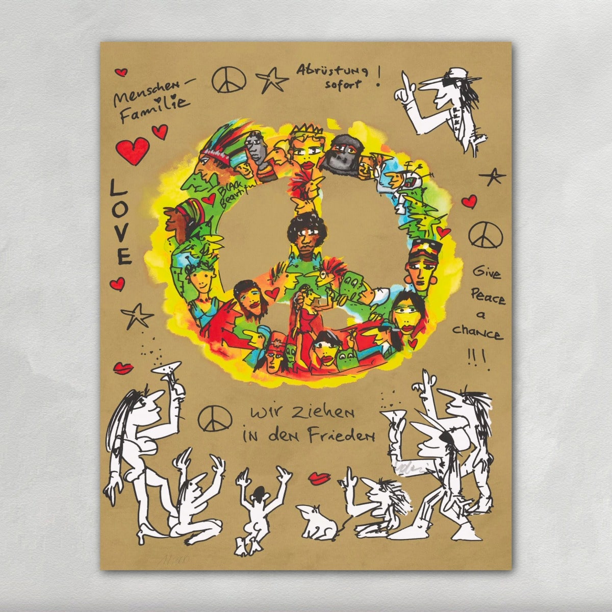 Udo Lindenberg nutzt in seiner bildenden Kunst häufig einfache Figuren und klare Gesten, um gesellschaftliche und menschliche Themen sichtbar zu machen. Frieden, Zusammenhalt und Haltung ziehen sich durch viele seiner Grafiken und Siebdrucke. „Wir ziehen in den Frieden“ steht exemplarisch für diese Bildsprache und verbindet Aussage mit Zugänglichkeit.