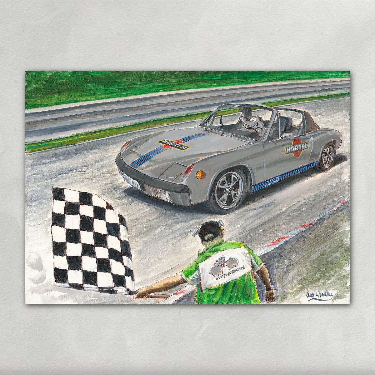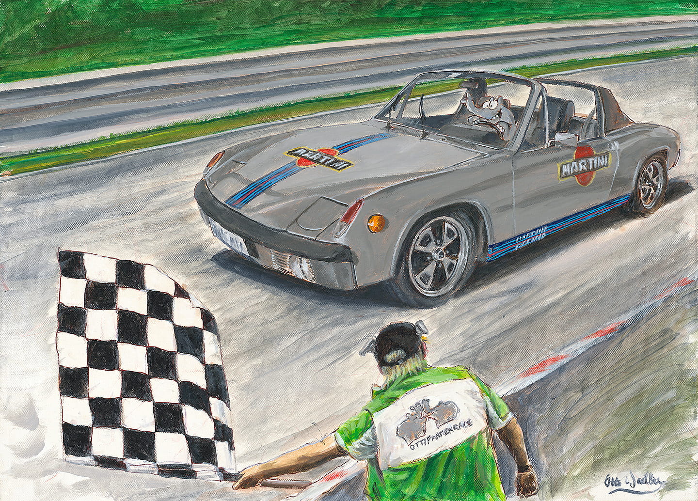 Kühle Grautöne des Fahrzeugs kontrastieren mit dem satten Grün der Umgebung. Die Flagge setzt einen starken grafischen Akzent und lenkt den Blick direkt auf den Schlüsselmoment. Der Hintergrund bleibt bewusst reduziert, um die Bewegung auf der Strecke zu betonen.